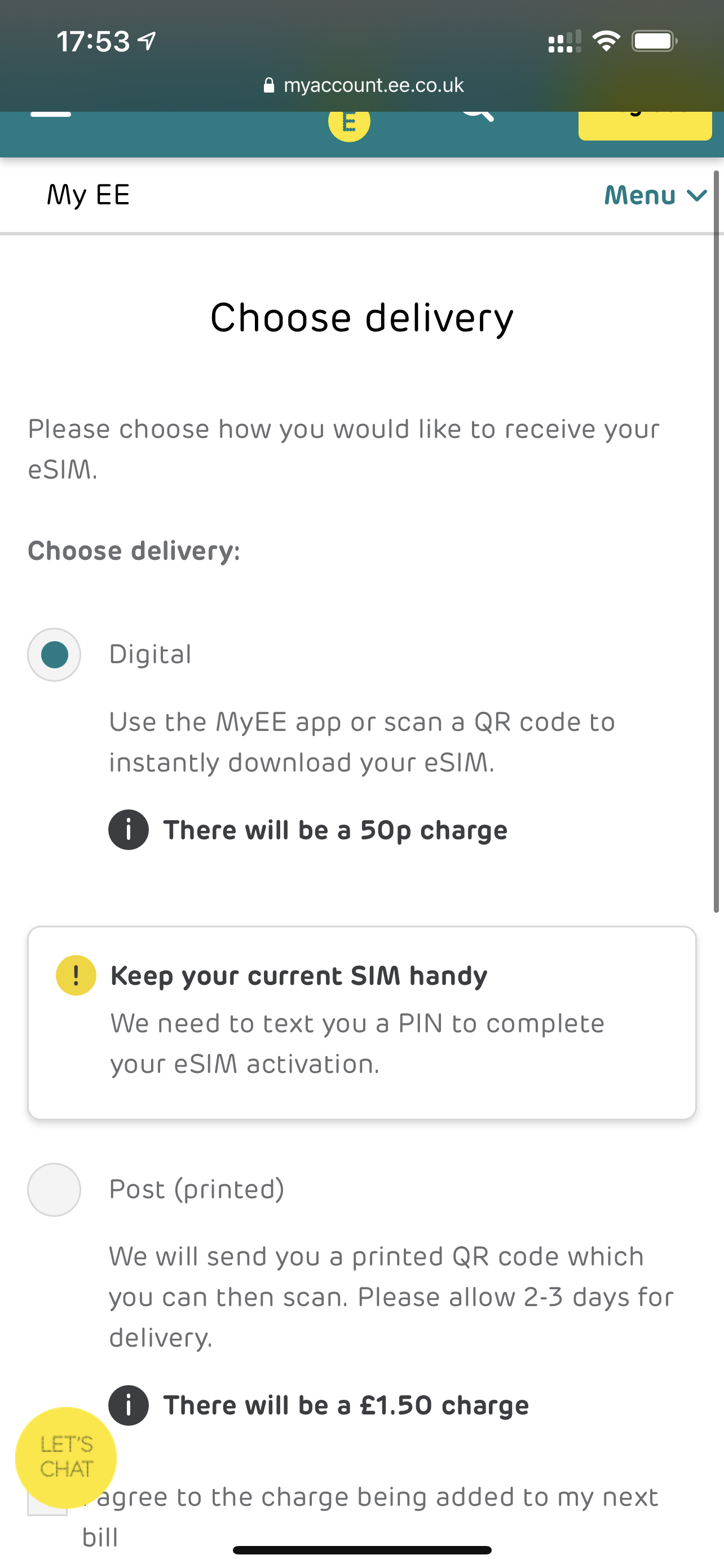 OneSimCard eSIM is delivered instantly online so there is no need to ship. If youre using the My EE app make sure youre using the latest version.
